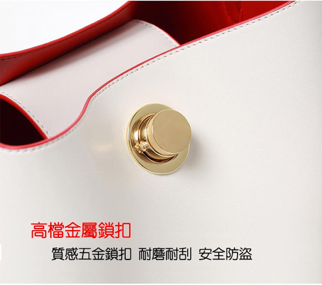 這點很重要,市面上許多這種造型的水桶包都採用束繩束口,一來超不方便,因為根本不好拉,而且會損傷包包。二來不實用,難拉的結果就是不用它,所以功能性盡失。所以採用鎖扣方式是很有設計概念的,而且搭配五金更提升了包包的貴氣與質感。